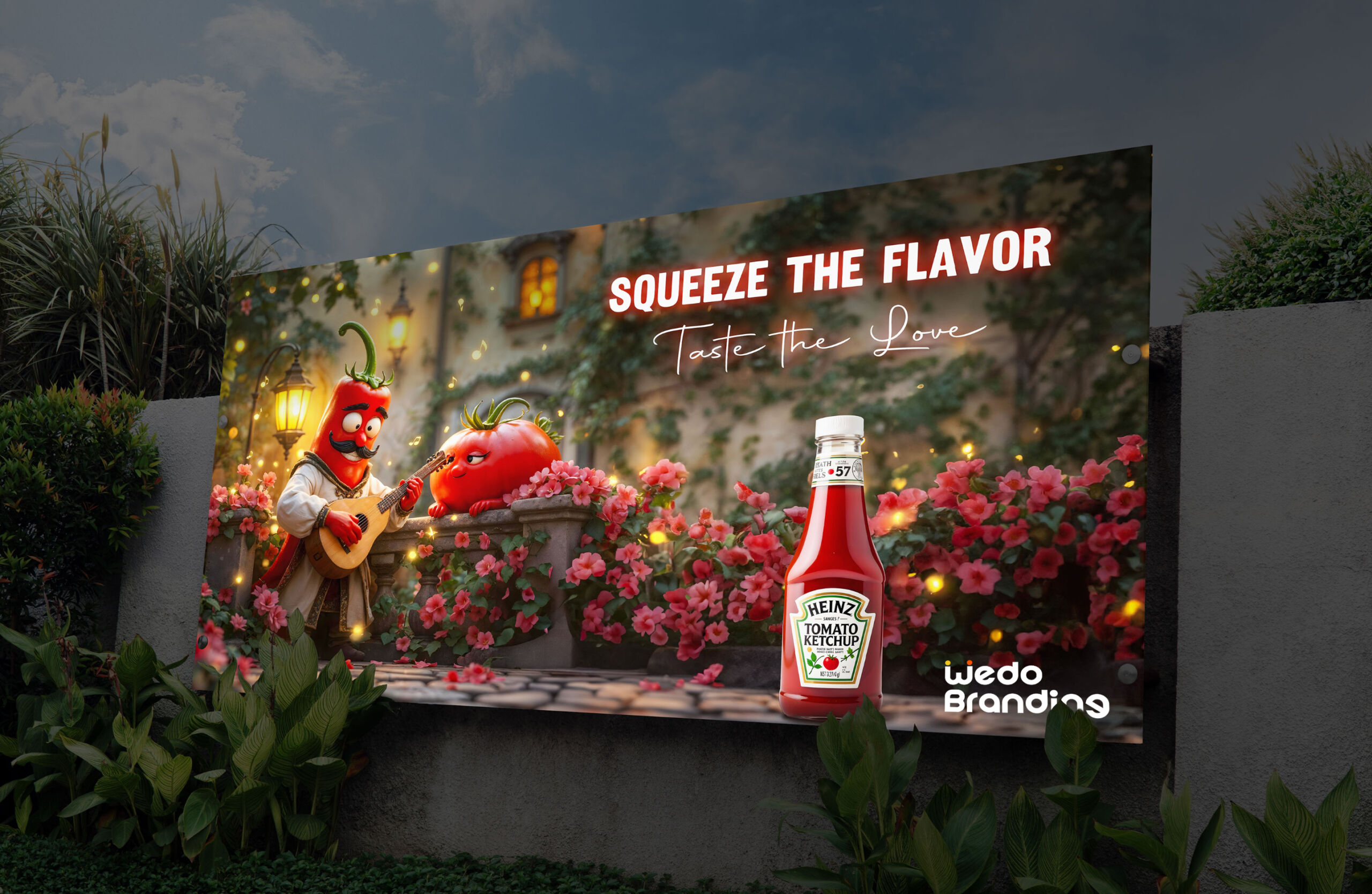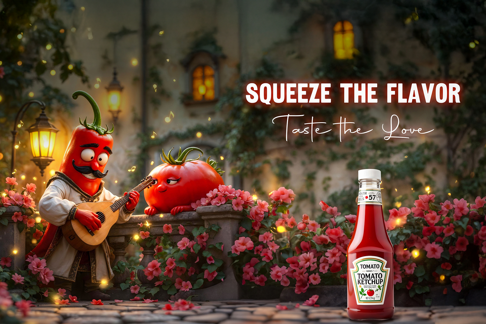This advertising concept transforms tomatoes into charming characters inside a magical evening courtyard, filled with warm lights, flowers, and music. One tomato serenades with a guitar while another listens, creating a romantic and whimsical mood that connects flavor with emotion.